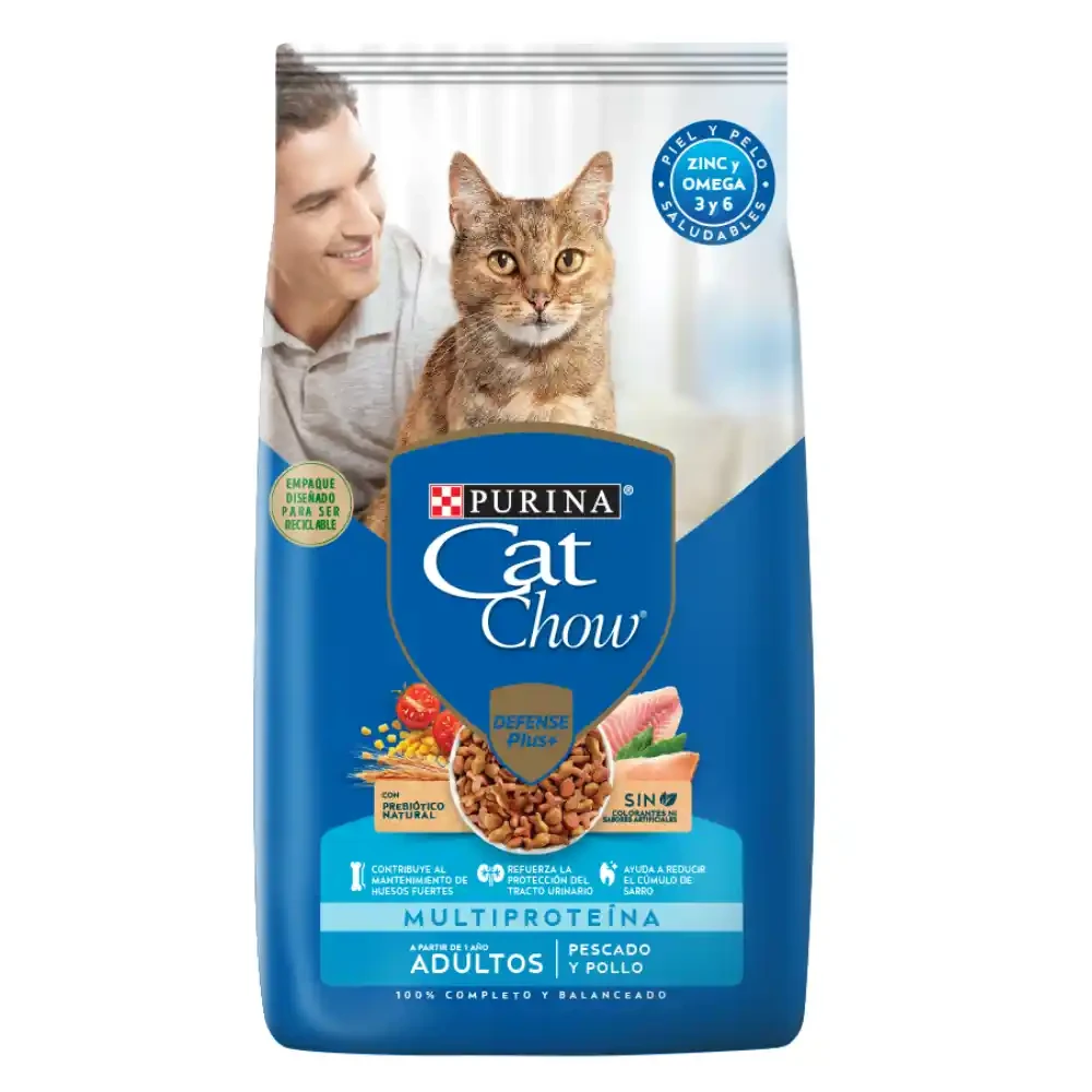 Cat Chow Alimento Balanceado para Gatos Adultos Sabor Pescado y Pollo PURINA® CAT CHOW® CON DEFENSE PLUS® , elaborado con una selección de ingredientes naturales y mejorado. Alimento completo y balanceado para gatos adultos de todos los tamaños.