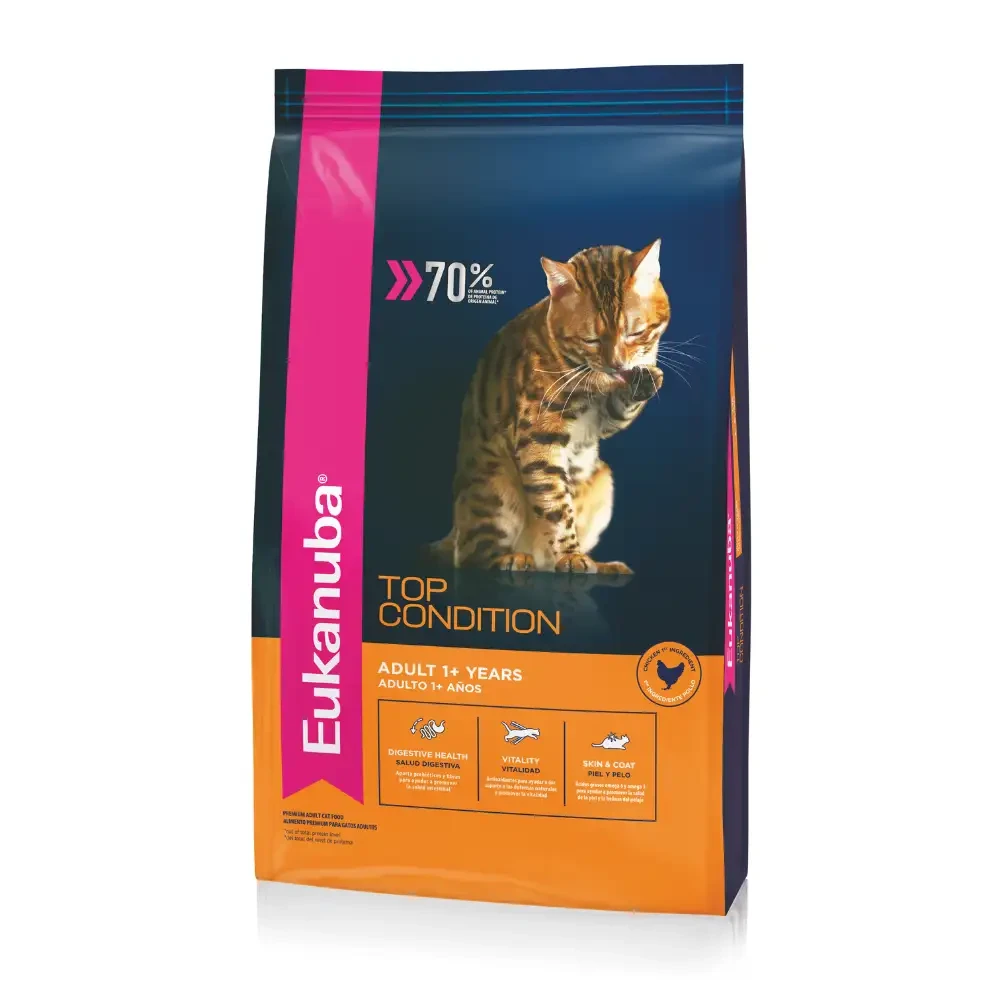 Eukanuba Gato es una línea de alimentación super premium formulada con ingredientes de alta calidad y nutrientes clave que promueven la salud de los gatos en cada etapa de su vida. Eukanuba Top Condition está elaborado con Pollo como primer ingrediente, utilizando un 70% de su fuente de proteína. Características: Salud Digestiva Aporta prebióticos y fibras para ayudar a promover la salud intestinal Vitalidad Antioxidantes para ayudar a dar soporte a las defensas naturales y promover la vitalidad Skin & Coat Ácidos grasos omega 6 y omega 3 para ayudar a promover la salud de la piel y la belleza del pelaje