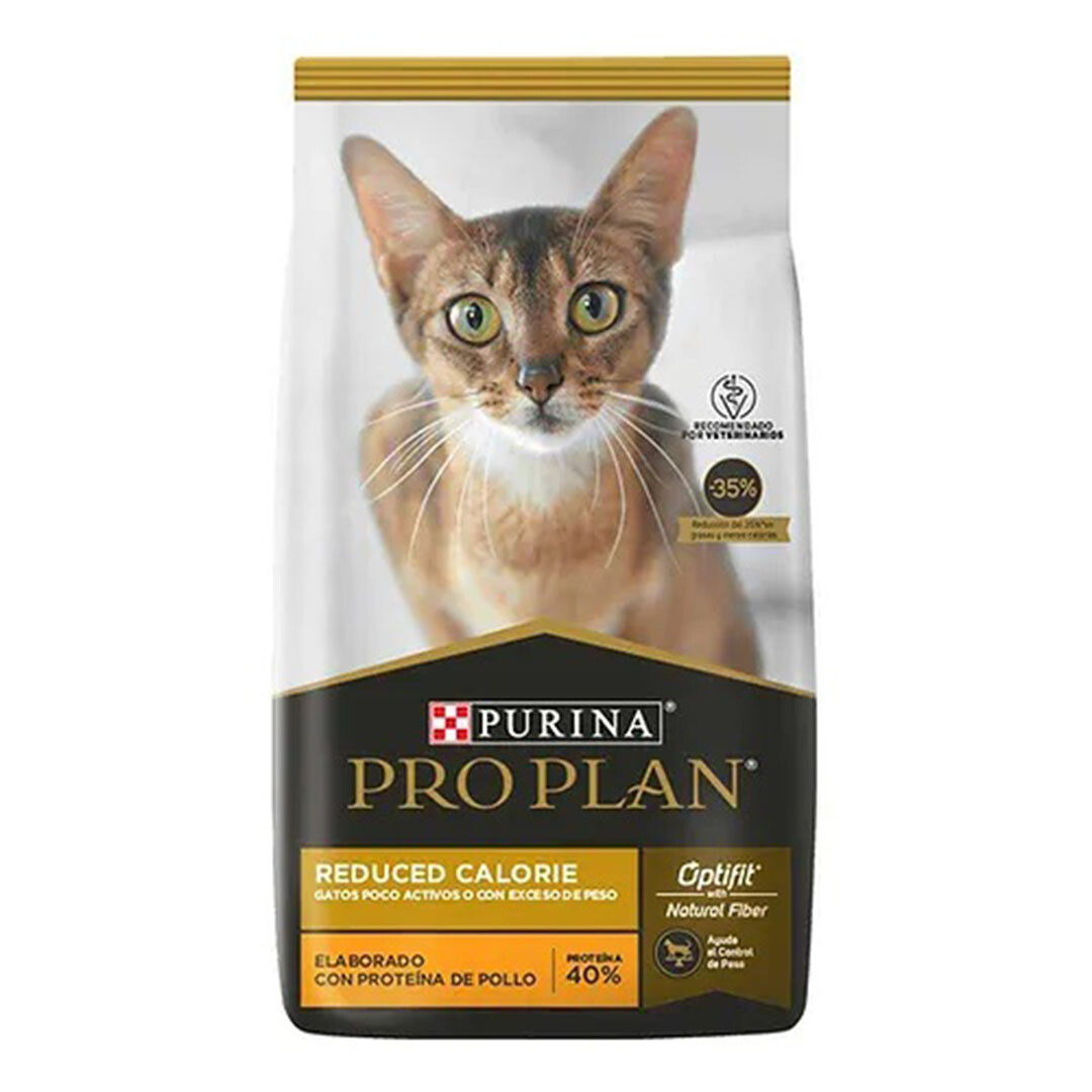 Los gatos menos activos y/o con tendencia al sobrepeso necesitan un alimento con menor aporte calórico aunque sin reducir el sabor. Desarrollado por Veterinarios y Nutricionistas de Purina, PURINA® PRO PLAN® Reduced Calorie Optifit ofrece una nutrición específica para los gatos con sobrepeso, promoviendo una condición corporal óptima y bienestar general. BENEFICIOS CONTROL DE PESO Formulado con niveles bajos de grasas y calorías, junto con un nivel elevado de fibra natural para ayudar a reducir peso. CONTROL DE BOLAS DE PELO Con fuentes de fibras naturales de la soja y de la celulosa que ayudan a controlar la formación de bolas de pelo. RECETA PALATABLE Ingredientes de alta calidad que proporcionan un excelente sabor a la fórmula. ÓPTIMA DISPONIBILIDAD DE NUTRIENTES La inclusión de minerales quelados ayuda a asegurar una óptima absorción y disponibilidad de nutrientes clave para la salud.
