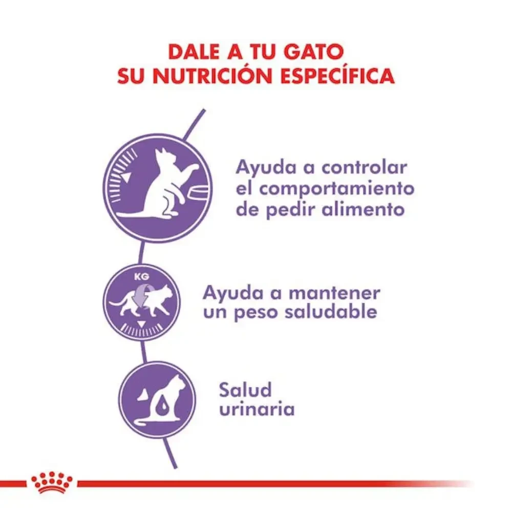 Royal Canin alimento seco para gato appetite control esta formulado para gatos adultos ayudando a controlar el comportamiento de pedir alimento. BENEFICIOS: Resultados comprobados Más del 90% de los propietarios observó una demanda de alimento controlada entre las comidas después de 4 semanas* Regulación del hambre: Favorece la sensación de saciedad El apetito de algunos gatos resulta difícil de saciar. Royal Canin Appetite Control ayuda a reducir la sensación de hambre con un contenido de humedad específico para ayudar a saciar el apetito de los gatos con tendencia a pedir alimento entre las comidas. Control del peso: Ayuda a limitar el riesgo de aumento de peso excesivo. Los gatos que piden alimento tienden a aumentar de peso. Este alimento ha sido elaborado con un contenido de grasa moderado y un contenido de energía preciso para ayudar a tu gato a mantenerse en forma.