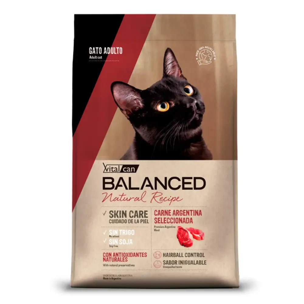 VITAL BALANCED NATURAL RECIPE CARNE ARGENTINA SELECCIONADA Receta monoproteíca a base de Carne Argentina Seleccionada que contribuye a reducir las reacciones alérgicas. Esta proteína es de alto valor biológico aportando aminoácidos esenciales y colaborando al desarrollo y mantenimiento muscular. Características: SKIN CARE, cuidado de la piel SIN TRIGO SIN SOJA CON ANTIOXIDANTES NATURALES HAIRBALL CONTROL SABOR INIGUALABLE