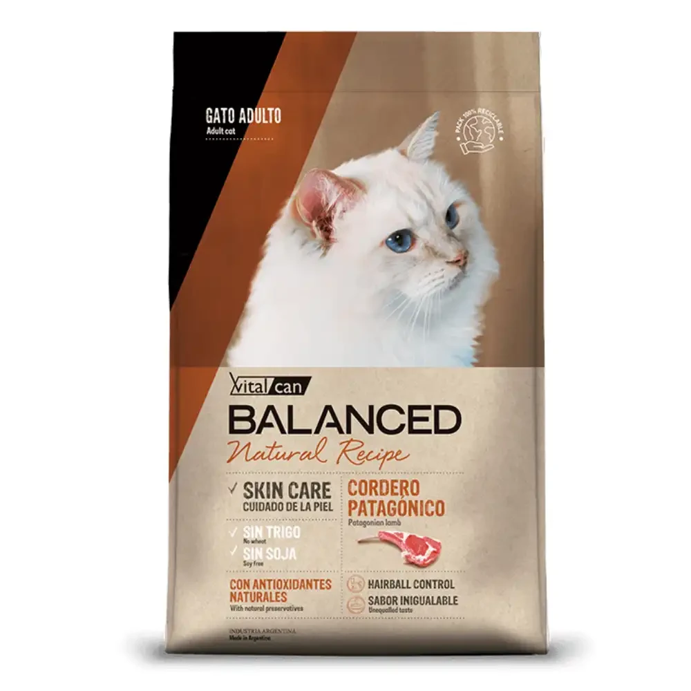 VITAL BALANCED NATURAL RECIPE CORDERO. Receta monoproteíca a base de cordero que contribuye a reducir las reacciones alérgicas. Características: SKIN CARE, cuidado de la piel SIN TRIGO SIN SOJA CON ANTIOXIDANTES NATURALES HAIRBALL CONTROL SABOR INIGUALABLE