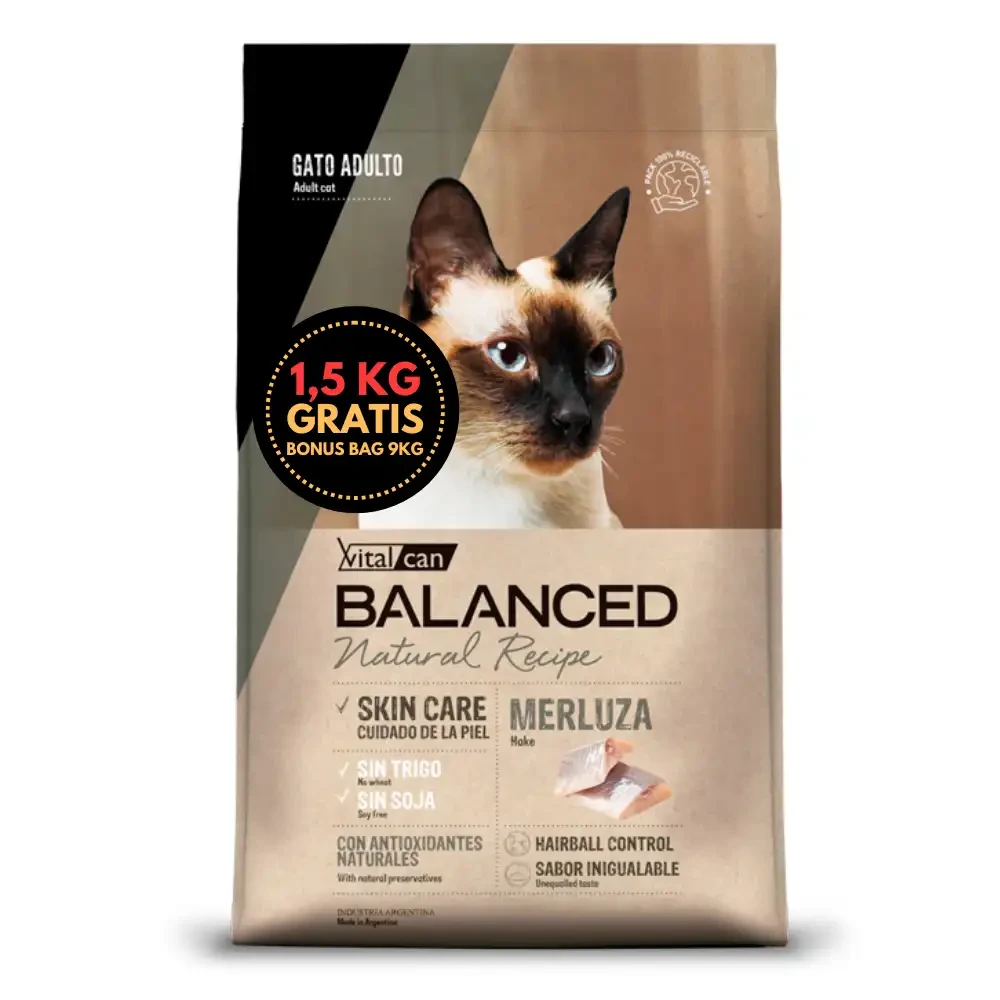 VITAL BALANCED NATURAL RECIPE MERLUZA – BONUS BAG 7,5KG + 1,5KG GRATIS – Receta monoproteíca a base de Merluza que contribuye a reducir las reacciones alérgicas. Características: SKIN CARE, cuidado de la piel SIN TRIGO SIN SOJA CON ANTIOXIDANTES NATURALES HAIRBALL CONTROL SABOR INIGUALABLE