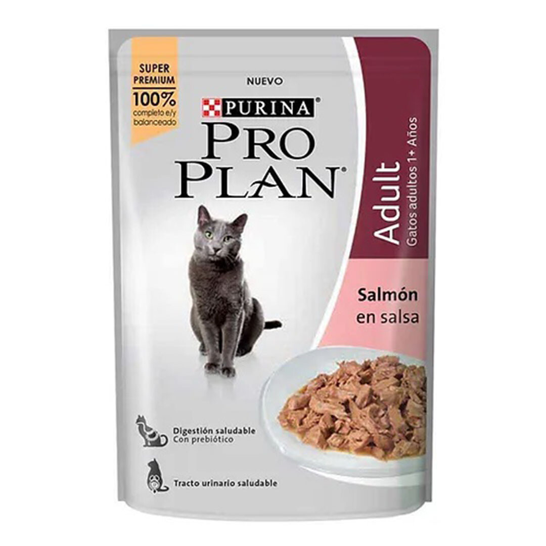 Pro Plan Adulto Salmón Alimento Húmedo Alimento húmedo completo y balanceado para gatos adultos de todas las razas. PURINA® PRO PLAN® alimento húmedo combina la nutrición que tu deseas con el sabor que a ellos les encanta. Un alimento 100% completo y balanceado, con deliciosos trozos en salsa y beneficios nutricionales únicos para cada necesidad. BENEFICIOS: Digestión saludable – Con prebiótico Tracto urinario saludable