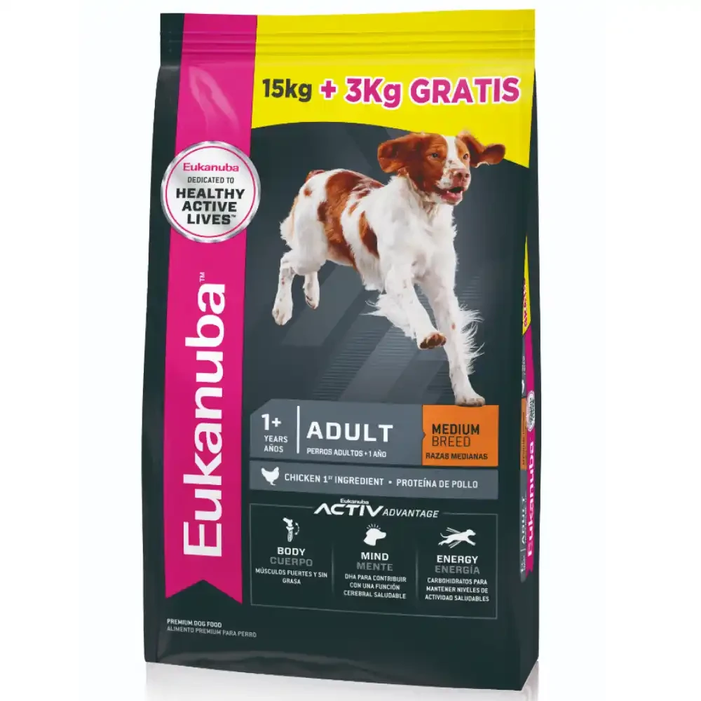 Eukanuba Adult Medium Breed es un alimento balanceado completo para perros adultos mayores a 12 meses de edad y de razas medianas que pesan entre 10 y 25 kg. BENEFICIOS: CUERPO ENERGÍA PIEL Y PELAJE MENTE DIENTES LIMPIOS, ENCÍAS SALUDABLES: DENTA DEFENSE