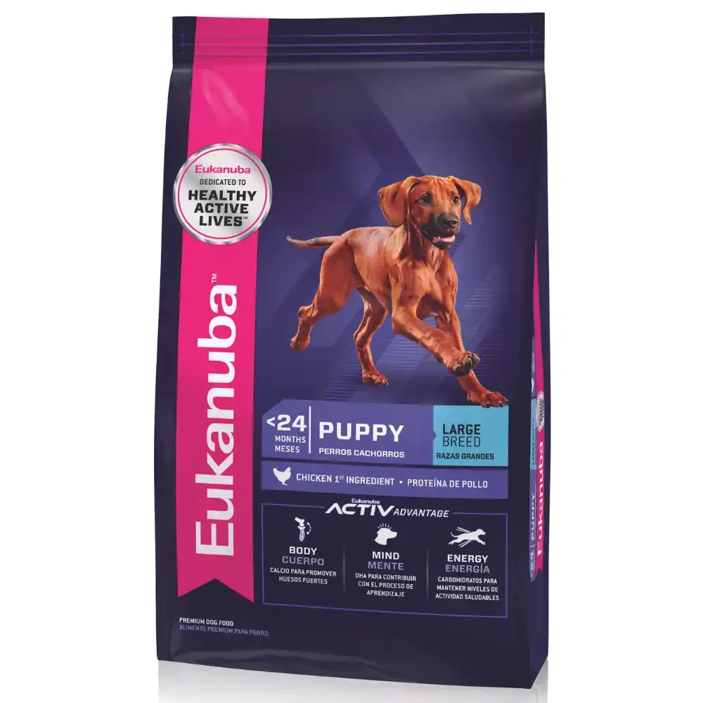 Eukanuba Puppy Large Breed es un alimento balanceado completo para cachorros entre 1 y 12 meses de edad en el caso de razas grandes, o hasta los 24 meses en el caso de razas gigantes que en su etapa adulta pesan más de 25 kg. Las fórmulas para cachorro de Eukanuba contribuye a una óptima digestión, desarrollo y mantenimiento de músculos magros, articulaciones y huesos fuertes. BENEFICIOS: CUERPO ENERGÍA DIGESTIÓN ÓPTIMA MENTE MUSCULOS MAGROS