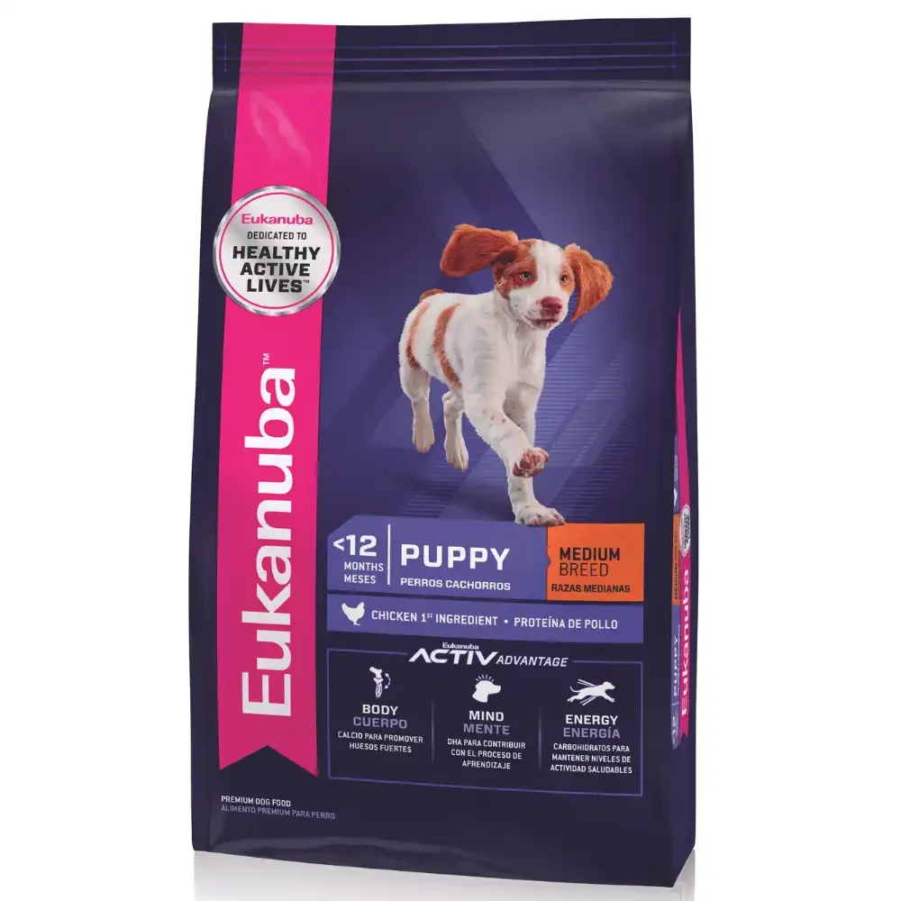 Eukanuba Puppy Medium Breed es un alimento balanceado completo para cachorros entre 1 y 12 meses de edad, de razas medianas que en su etapa adulta pesan entre 10 y 25 kg. Las fórmulas para cachorro de Eukanuba apoyan el óptimo desarrollo neurológico del cachorro y maximizar su capacidad de aprendizaje durante el entrenamiento. Contribuye a una óptima digestión, desarrollo y mantenimiento de músculos magros, articulaciones y huesos fuertes. BENEFICIOS: CUERPO ENERGÍA DIGESTIÓN ÓPTIMA MENTE MÚSCULOS MAGROS