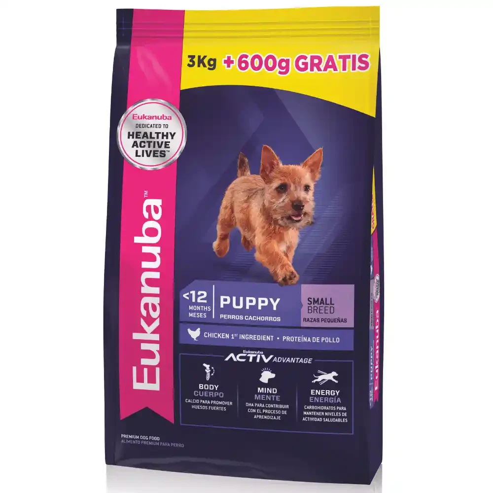 EUKANUBA PUPPY SMALL BREED Alimento balanceado completo para cachorros de talla pequeña como Caniche, Yorkshire Terrier y otras razas o perros mestizos que en su etapa adulta pesan menos de 10 kg. Recomendado para cachorros entre 1 y 12 meses de edad. También recomendado durante la gestación y lactancia. Durante las últimas tres semanas de gestación, incremente la cantidad de alimento en un 25 % a 50%. Durante la lactancia ofrézcale alimento sin restricciones (generalmente de dos a cinco veces la cantidad que sugiere la guía de alimentación, dependiendo del tamaño y de la raza). BENEFICIOS: CUERPO ENERGÍA DIGESTIÓN ÓPTIMA MENTE MÚSCULOS MAGROS