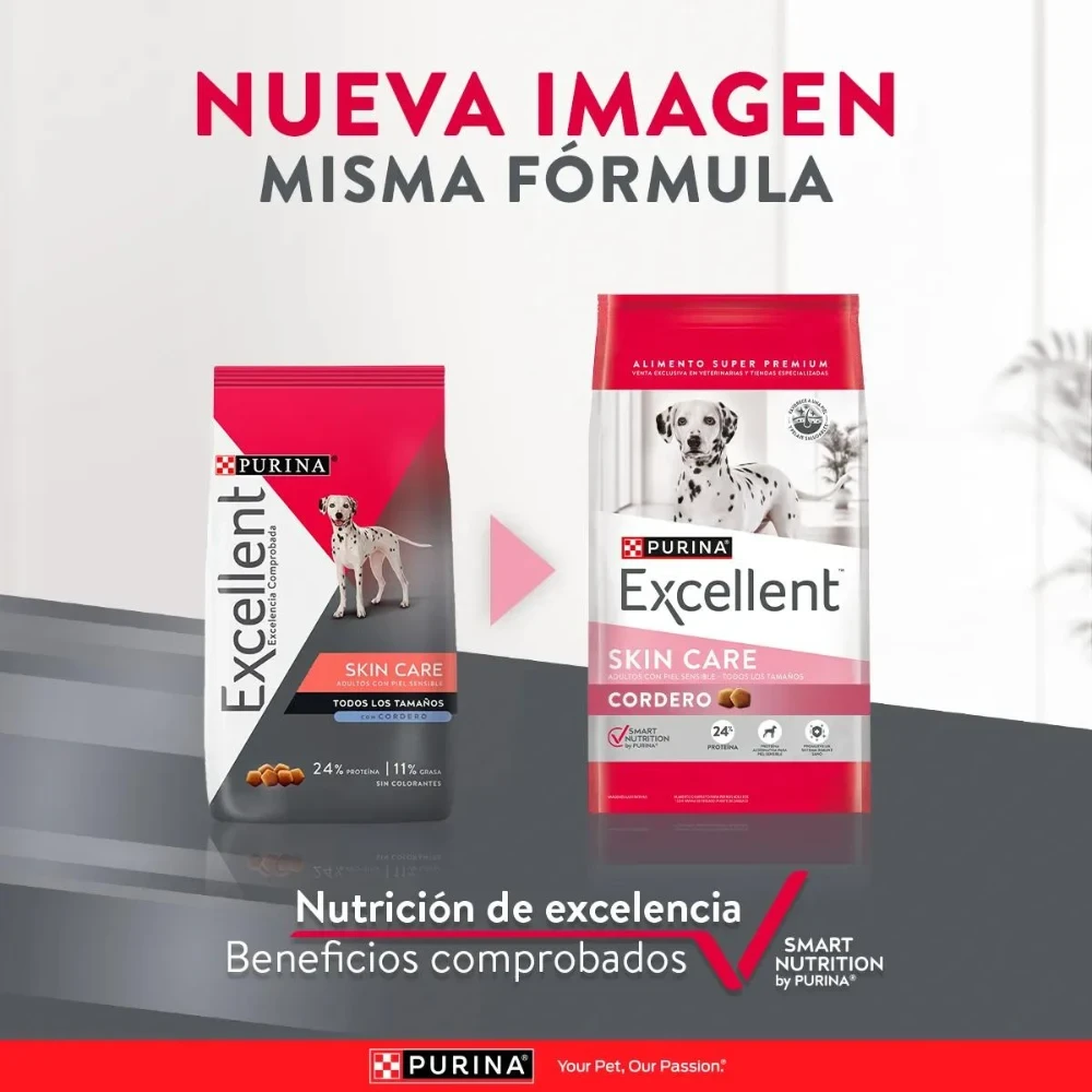 PURINA® EXCELLENT™ le ofrece una fórmula con fuente de proteína alternativa de elevada digestibilidad como el cordero, que contribuye a la salud de la piel. Con el sistema SMART NUTRITION BY PURINA®, que aporta múltiples beneficios científicamente comprobados, que mantienen a tu perro adulto con un excelente estado de salud. Proteína alternativa para piel sensible Favorece a una piel y pelaje saludables Promueve un sistema inmune sano