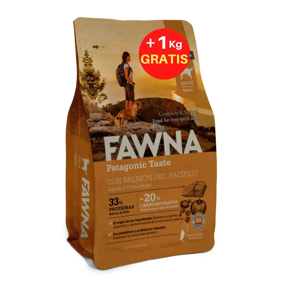 Fawna Patagonic Taste con salmón es un alimento seco balanceado completo para perros adultos de razas pequeñas entre 12 meses y 7 años de edad. Entre sus ingredientes posee salmón del pacífico, zapallo y frutos rojos. También posee un 33% de proteínas tales como el salmón y el pollo.