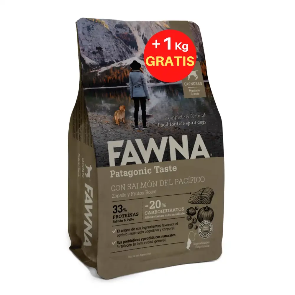 Fawna Patagonic Taste con salmón es un alimento seco balanceado completo para perros cachorros de razas medianas y grandes de hasta 12 meses de edad. Entre sus ingredientes posee salmón del pacífico, zapallo y frutos rojos. También posee un 33% de proteínas tales como el salmón y el pollo, además de un 20% menos de carbohidratos. Estos ingredientes inducen a favorecer al máximo el desarrollo cognitivo y corporal fundamental en la primer etapa de vida de un cachorro.