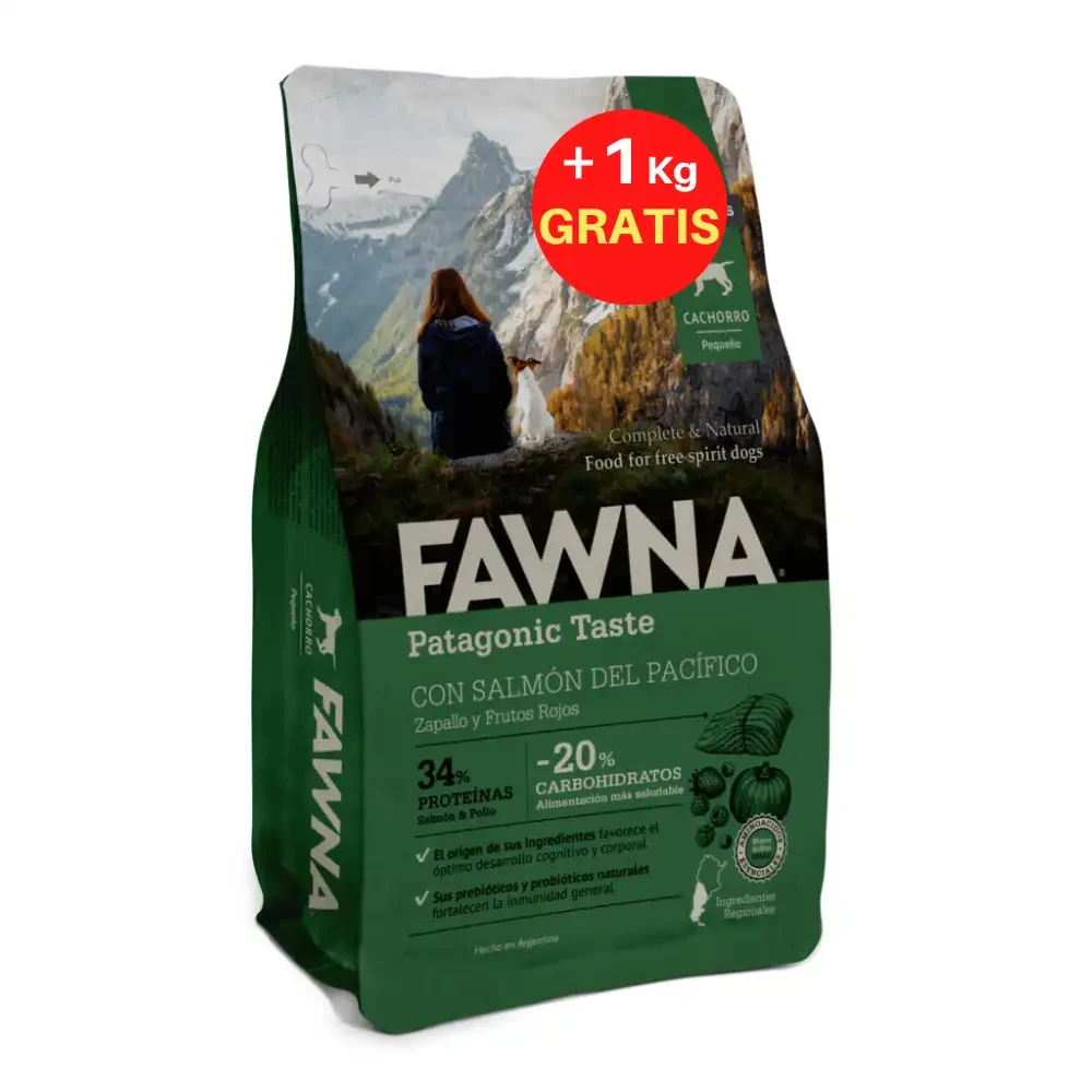 Fawna Patagonic Taste con salmón es un alimento seco balanceado completo para perros cachorros de razas pequeñas de hasta 12 meses de edad. Entre sus ingredientes posee salmón del pacífico, zapallo y frutos rojos. También posee un 33% de proteínas tales como el salmón y el pollo, además de un 20% menos de carbohidratos. Estos ingredientes inducen a favorecer al máximo el desarrollo cognitivo y corporal fundamental en la primer etapa de vida de un cachorro.