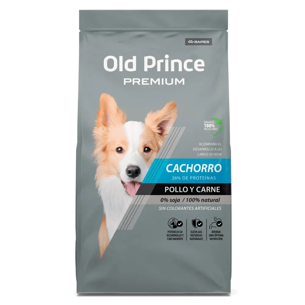 Características: Old Prince Premium Cachorros sabor Pollo y Carne es un alimento balanceado para perros cachorros. Su fórmula contiene un 26% de proteína, además de ofrecer los nutrientes necesarios para el crecimiento saludable del cachorro. Así mismo, es 100% natural y no contiene soja, siendo una opción súper saludable. Está diseñado para elevar las defensas naturales y evitar enfermedades que perjudiquen el desarrollo del perro.