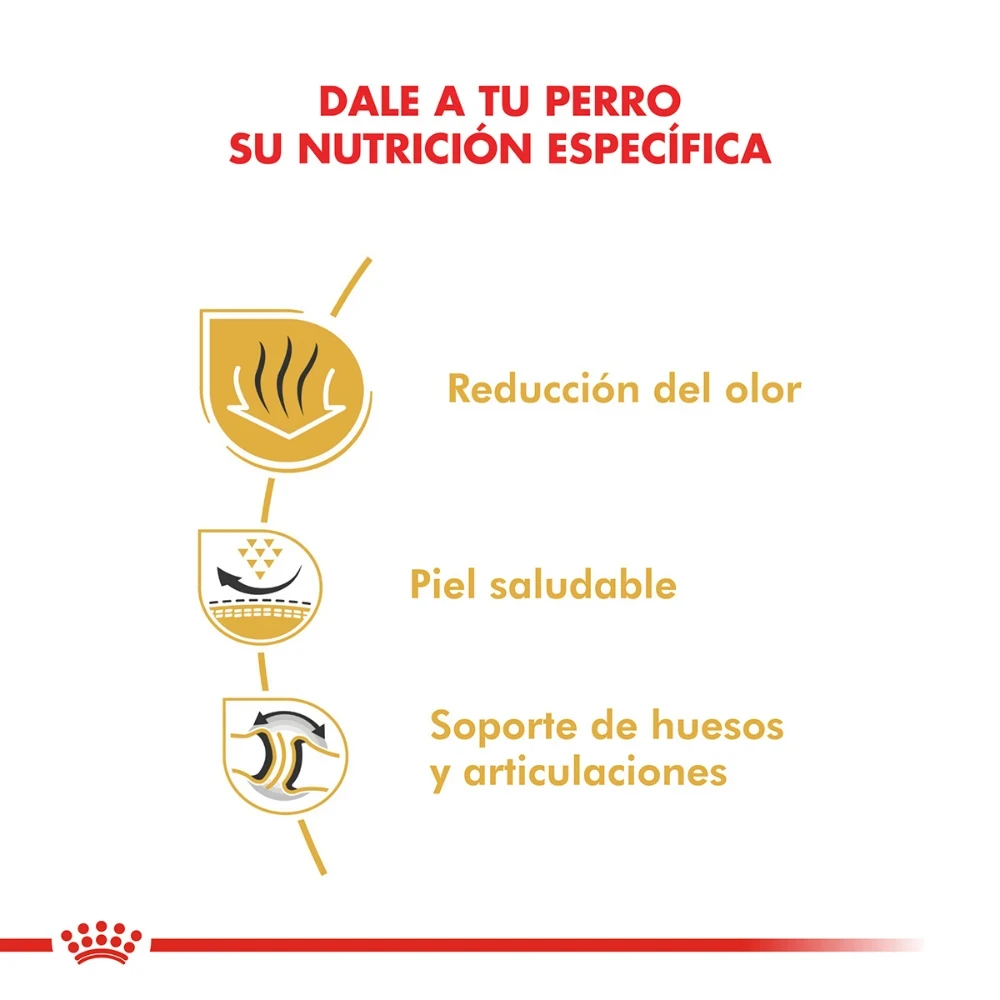 Alimento para perros adultos y maduros de raza Bulldog – Desde los 12 meses de edad. BENEFICIOS: Reducción del olor Esta fórmula contribuye a reducir la fermentación intestinal que puede causar trastornos digestivos, flatulencias y mal olor de las heces. Piel saludable Esta fórmula ayuda a promover la función natural de «barrera» de la piel y a mantener su salud. Soporte de huesos y articulaciones Esta fórmula exclusiva contribuye en la salud de huesos y las articulaciones y a mantener el peso ideal. Croqueta exclusiva: especial para mandíbulas braquicefálicas Esta croqueta exclusiva está diseñada para facilitar presión y estimular la masticación en el Bulldog.
