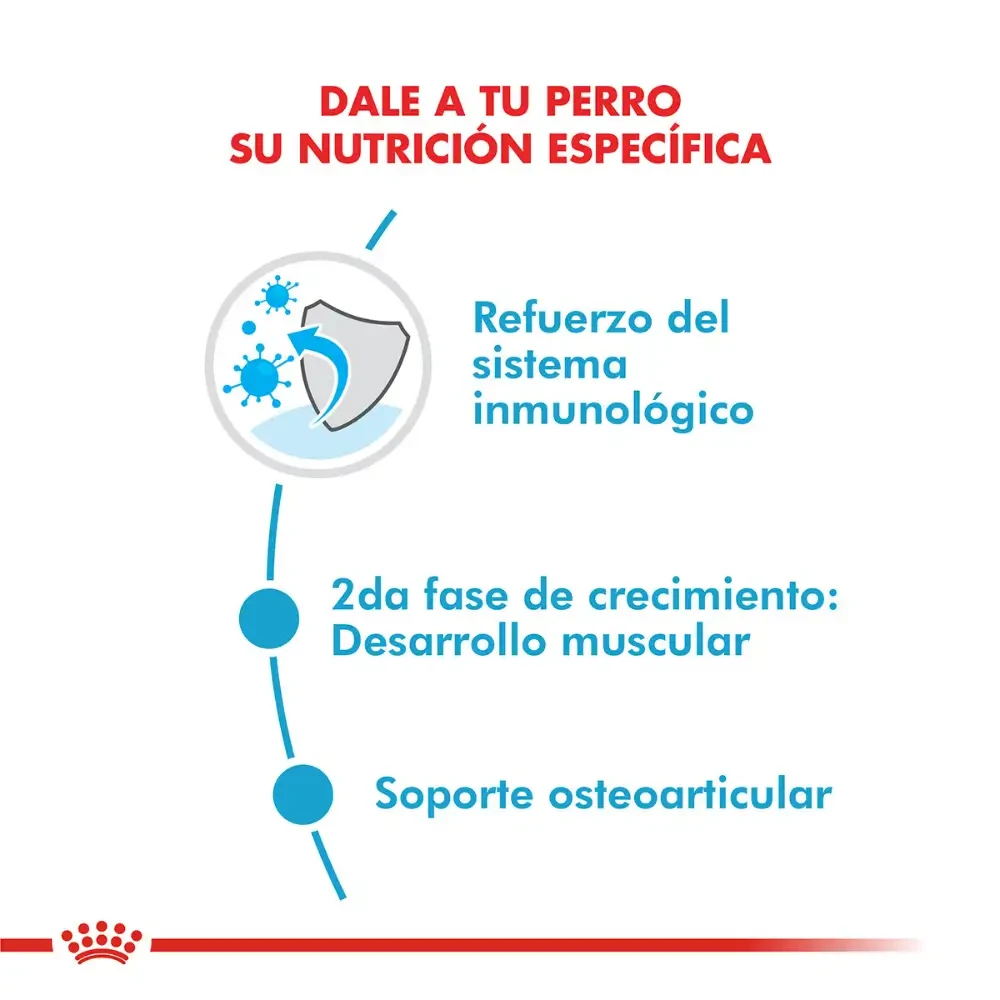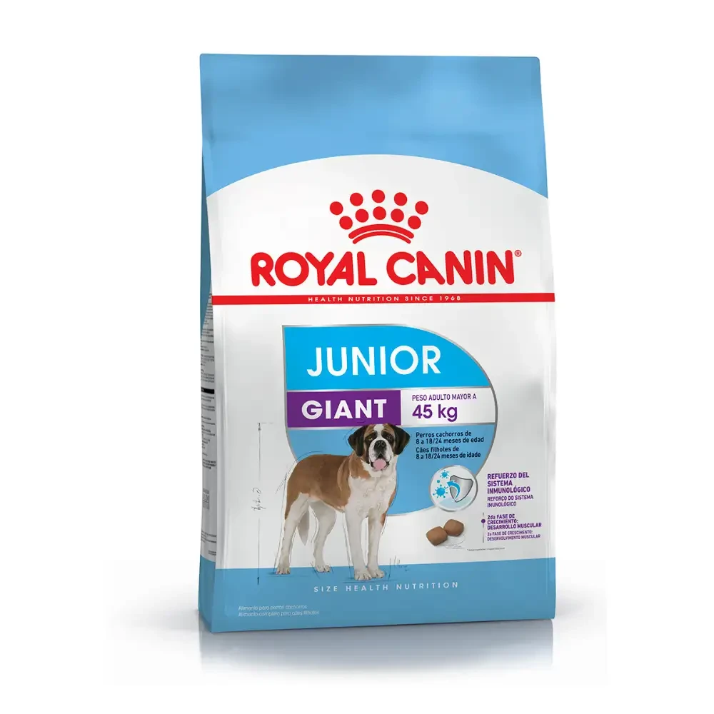 Royal Canin Giant Junior ayuda a reforzar las defensas naturales, brinda soporte al desarrollo muscular durante la segunda fase de crecimiento del cachorro y colabora con la buena mineralización ósea. BENEFICIOS: Refuerzo del sistema inmunológico 2da Fase de crecimiento: Desarrollo muscular Soporte osteoarticular