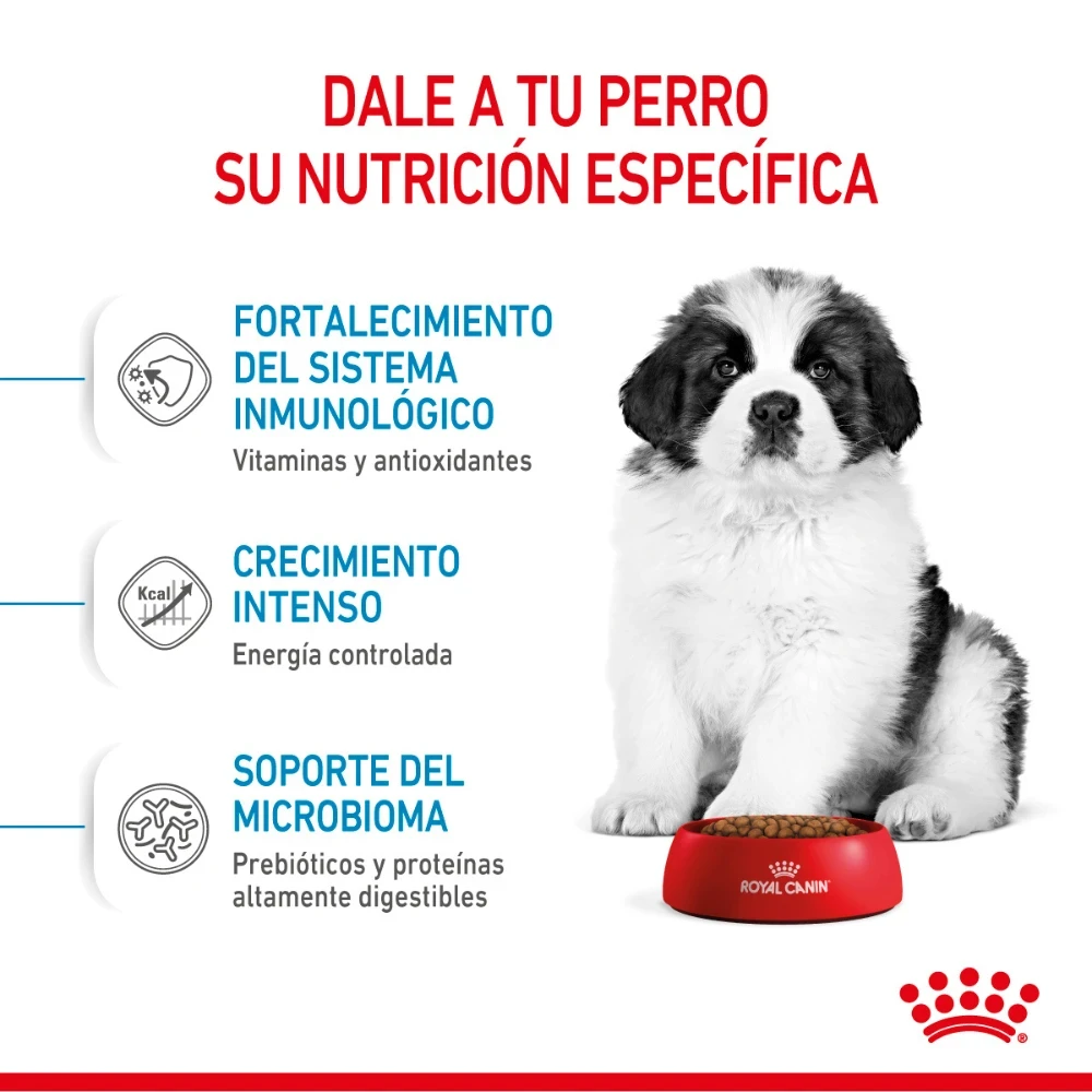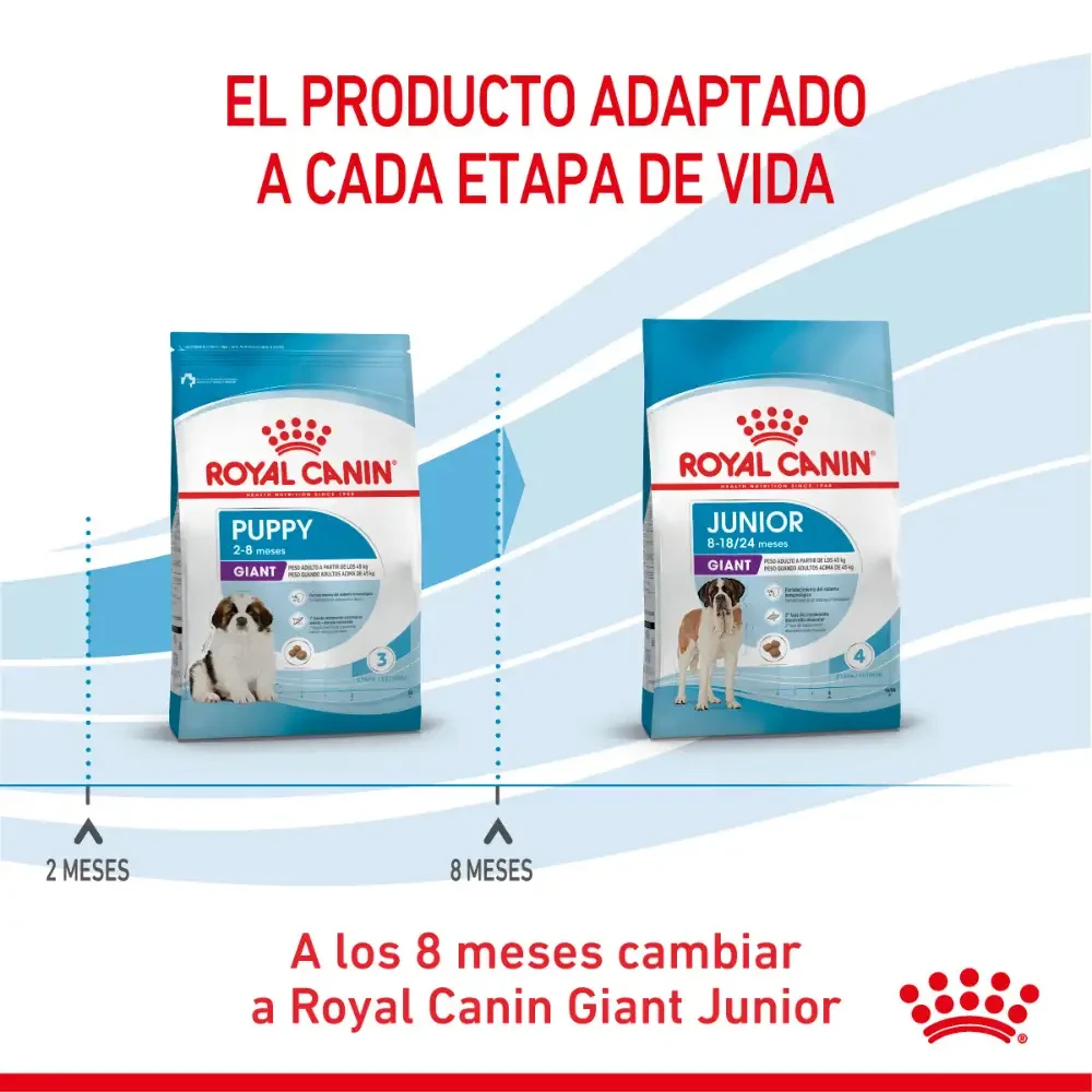 ROYAL CANIN GIANT PUPPY 15 Kg Alimento para perros cachorros de talla gigante (peso adulto > 45 kg). Desde los 2 hasta los 8 meses de edad. Refuerzo del sistema inmunológico Mientras crece, su cachorro experimenta grandes cambios y nuevos descubrimientos. Durante este periodo clave, el sistema inmunológico del cachorro sigue desarrollándose gradualmente. Giant Puppy ayuda a reforzar las defensas naturales de su cachorro gracias a un exclusivo complejo de antioxidantes, incluyendo vitamina E. Crecimiento intensivo – Contenido regulado de energía Contribuye a mantener una alta tasa de crecimiento durante la primer fase de crecimiento en los cachorros de talla gigante, y ayuda a evitar una excesiva ganancia de peso gracias a un contenido de energía adaptado. Soporte osteoarticular Contribuye a la buena mineralización ósea en los cachorros de talla gigante gracias a una ingesta balanceada de energía y minerales (calcio y fósforo), apoyando así la consolidación de huesos y articulaciones.