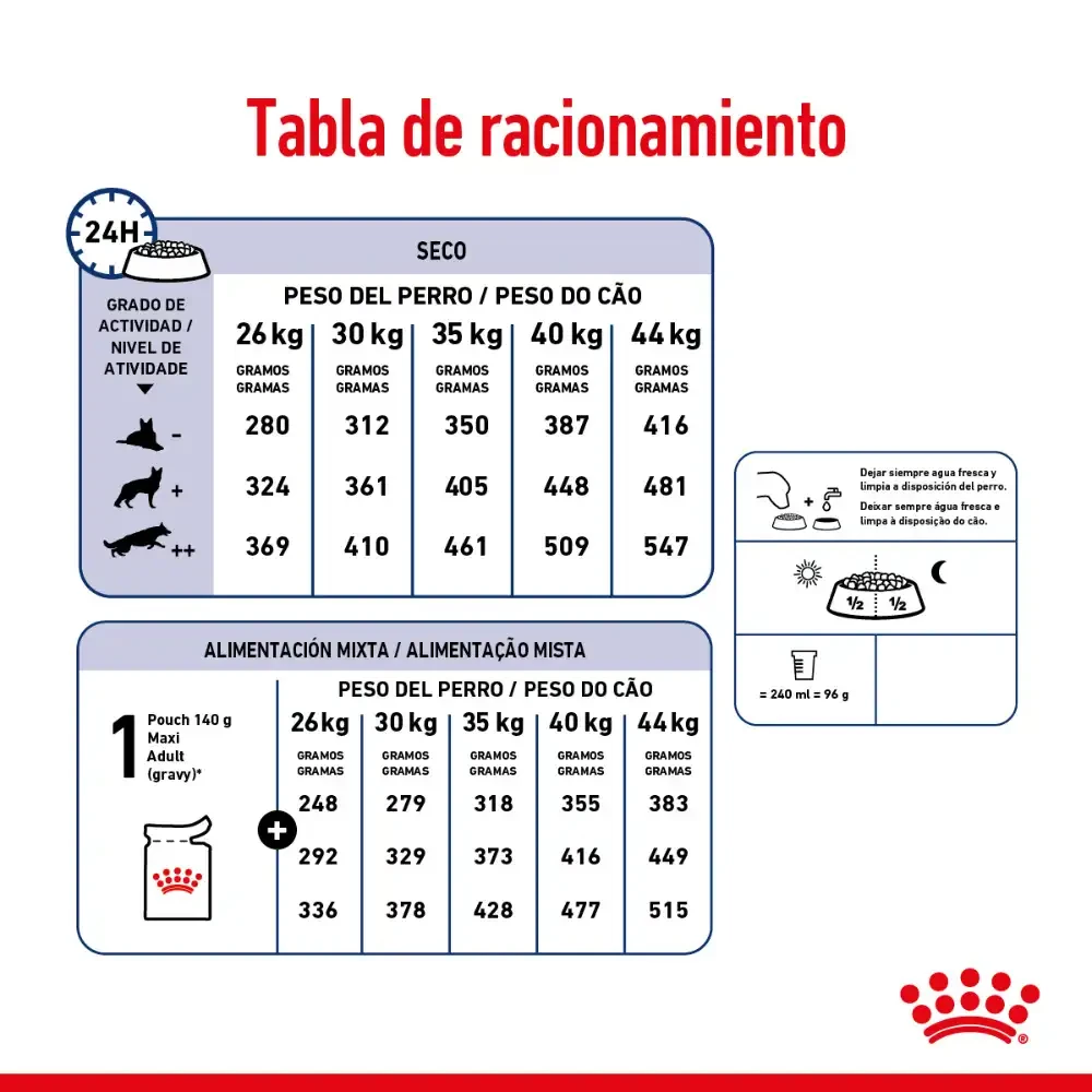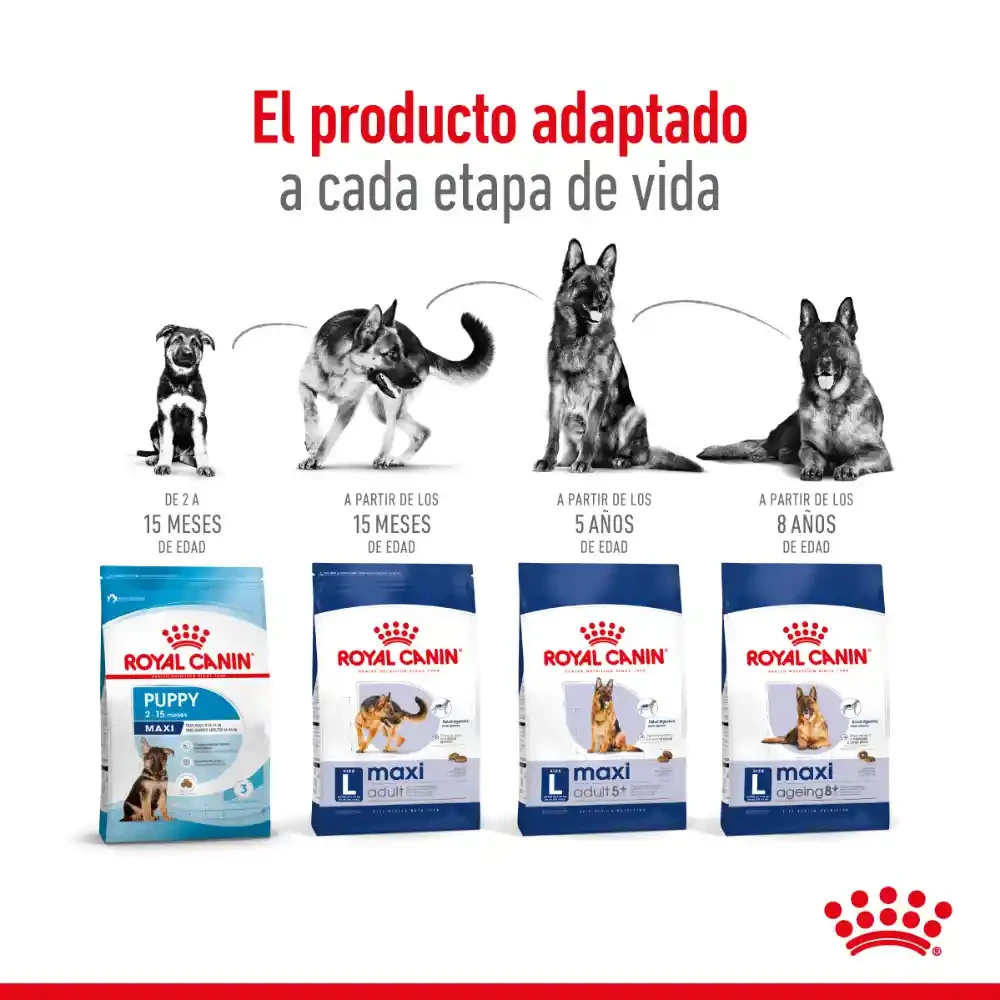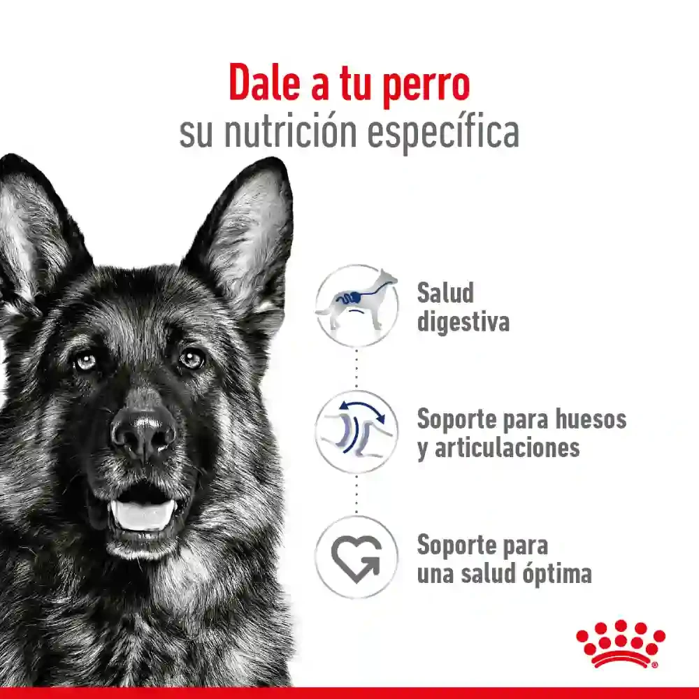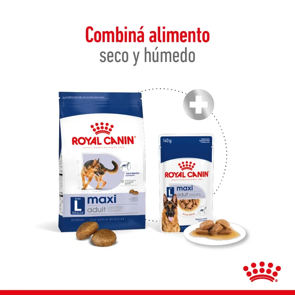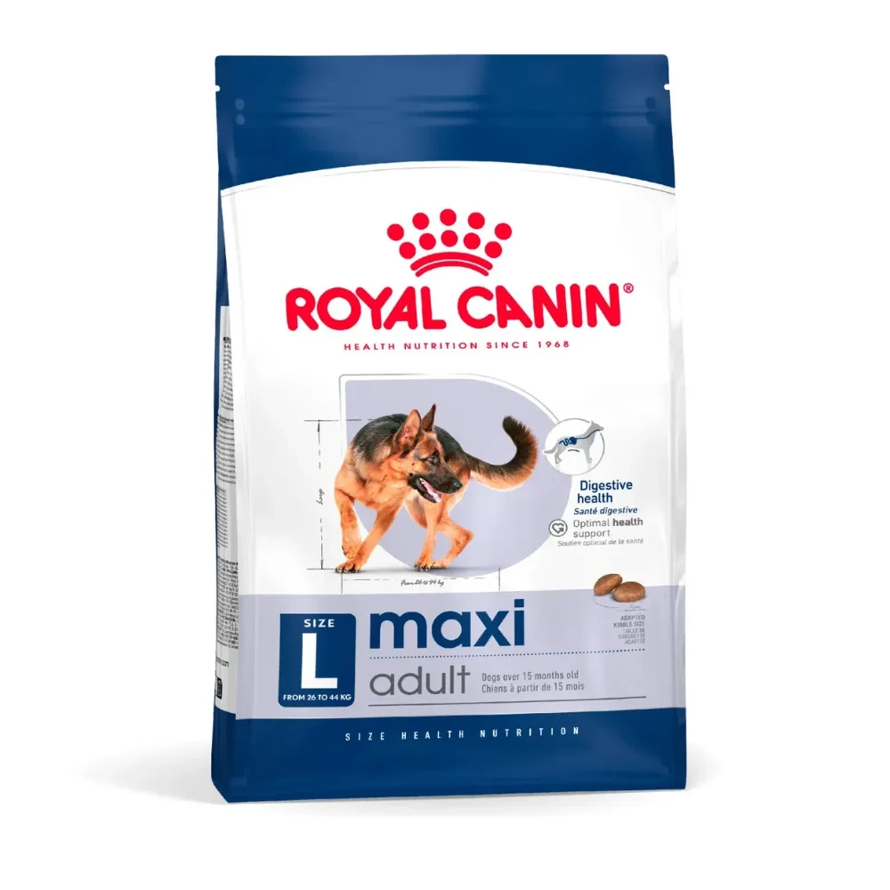 Royal Canin Maxi Adulto contribuye a una óptima digestibilidad y a mantener una piel saludable y ayuda a mantener huesos y articulaciones saludables en perros de talla grande. BENEFICIOS: Alta digestibilidad Ayuda a mantener una digestibilidad óptima gracias a una fórmula exclusiva que contiene proteínas de alta calidad y un aporte balanceado de fibras dietarias. Salud osteoarticular Ayuda a mantener huesos y articulaciones saludables en perros de talla grande, las cuales pueden estar sometidas a estrés debido a su peso corporal.