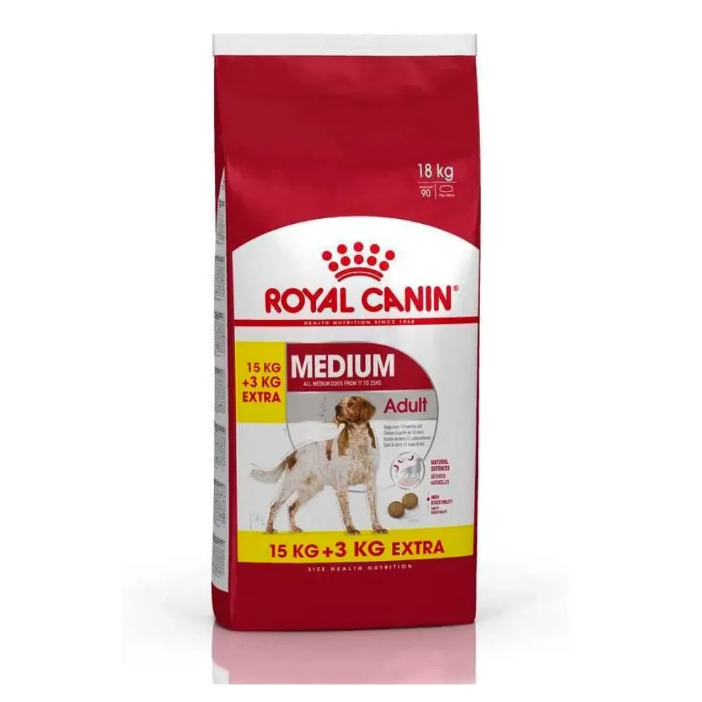 Royal Canin Medium Adult Alimento completo para perros adultos de talla mediana (de 11 a 25 kg). Desde los 12 meses hasta los 7 años de edad. Ayuda a mantener una óptima digestibilidad gracias a una fórmula exclusiva que incluye proteínas de alta calidad y un aporte balanceado de fibras dietarias.