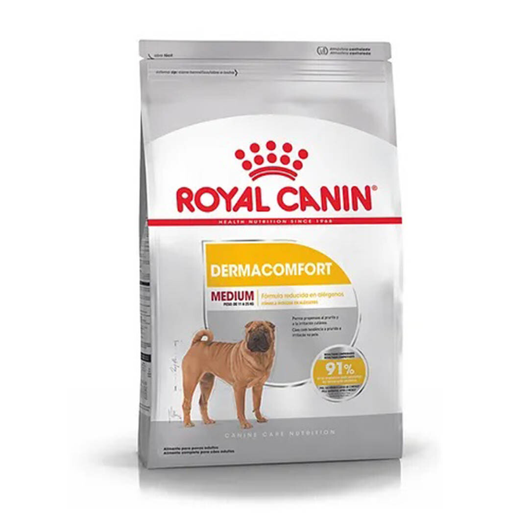 Royal Canin Medium Dermacomfort contiene una fórmula reducida en alérgenos y ayuda a reforzar la barrera cutánea, a promover una piel saludable y a combatir a los radicales libres debido a la combinación sinérgica de antioxidantes. BENEFICIOS: Nutrición para piel sensible Formulado para ayudar a cuidar y nutrir su piel sensible, manteniendo un pelaje saludable. Resultados comprobados 91% de los propietarios están satisfechos. Piel saludable luego de 2 meses* *Estudio interno Royal Canin.