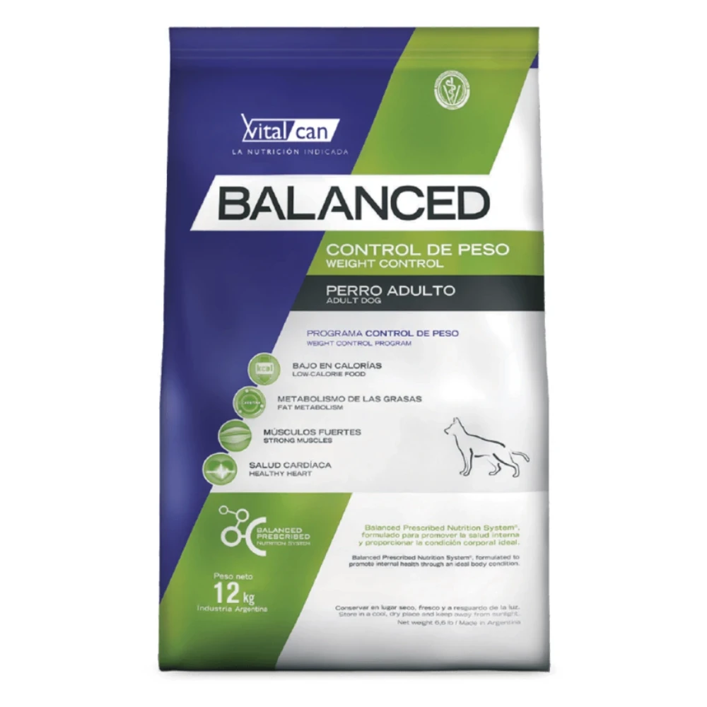 VITAL CAN BALANCED ADULTO CONTROL DE PESO Programa Control de Peso. Indicado para perros adultos con sobrepeso o con tendencia al sobrepeso. Vitalcan Balanced es ideal para perros adultos con sobrepeso o con tendencia al mismo, porque su Programa Control de Peso les proporciona: Bajas calorías Metabolismo de las grasas Músculos fuertes Salud cardíaca Salud osteoarticular Control del sarro