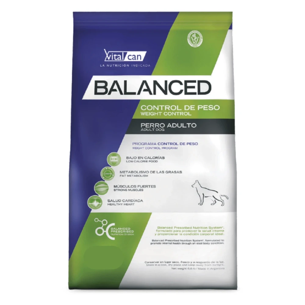 VITAL CAN BALANCED ADULTO CONTROL DE PESO Programa Control de Peso. Indicado para perros adultos con sobrepeso o con tendencia al sobrepeso. Vitalcan Balanced es ideal para perros adultos con sobrepeso o con tendencia al mismo, porque su Programa Control de Peso les proporciona: Bajas calorías Metabolismo de las grasas Músculos fuertes Salud cardíaca Salud osteoarticular Control del sarro