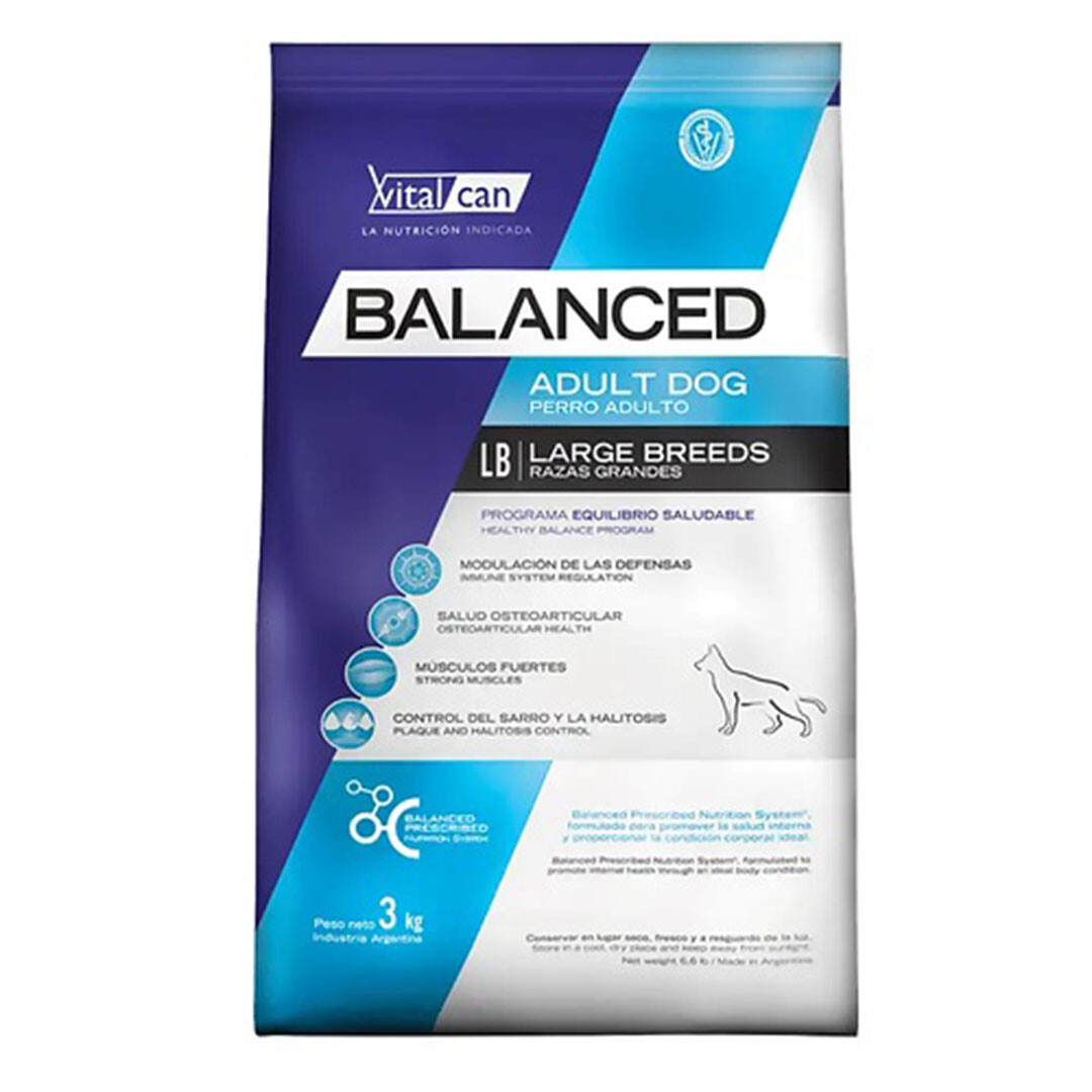 VITAL CAN BALANCED ADULTO RAZA GRANDE   Programa Equilibrio Saludable. Indicado para perros adultos de raza grande de 18 meses hasta 7 años. Vitalcan Balanced es ideal para perros adultos de raza grande porque su Programa Equilibrio Saludable les proporciona: Modulación de defensas Salud osteoarticular Músculos fuertes Control del sarro Cuidado óseo