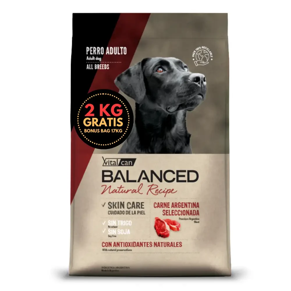 BALANCED NATURAL RECIPE CARNE ARGENTINA SELECCIONADA. – BONUS BAG 15KG + 2KG GRATIS – Receta monoproteíca a base de carne argentina seleccionada, reconocida internacionalmente por su gran calidad. Es fuente de proteínas de alto valor biológico aportando aminoácidos esenciales y colaborando al desarrollo y mantenimiento muscular. ORAL CARE: Con el agregado de hexametafosfato para ayudar a prevenir el desarrollo de sarro dental. DIGESTIVE PROTECT: Los prebióticos favorecen el desarrollo de bacterias benéficas del intestino, lo que contribuye a mejorar la absorción intestinal, lograr un proceso digestivo óptimo y aumentar las defensas naturales. HEALTHY JOINTS: Con glucosamina y metilsulfonilmetano, que ayudan a proteger el sistema osteoarticular del perro adulto, ya que colaboran con la regeneración y protección del cartílago articular. MUSCLE BOOST: El balance de nutrientes y la alta calidad de las proteínas favorecen el mantenimiento de una masa muscular fuerte y sana.