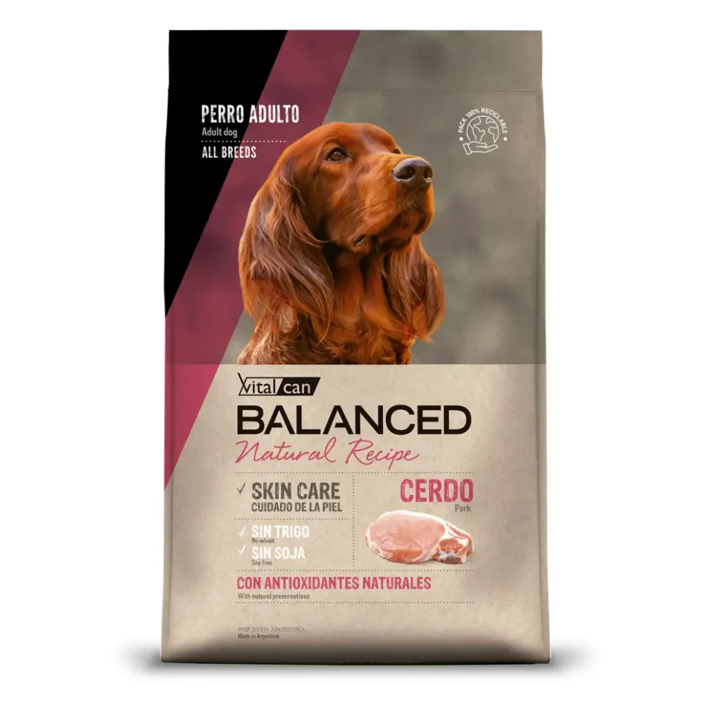 BALANCED NATURAL RECIPE CERDO. Receta monoproteíca a base de Cerdo que contribuye a reducir las reacciones alérgicas. El plus de Omega3 ayuda a mejorar la condición de la piel y los signos digestivos de la intolerancia alimentaria. SKIN CARE ORAL CARE DIGESTIVE PROTECT HEALTHY JOINTS ¿POR QUÉ ES UNA PROPUESTA NATURAL? Porque cuenta con proteínas alternativas y antioxidantes naturales, que conservan la frescura del alimento y brinda protección como antioxidante celular, a diferencia de los sintéticos que solo preservan el alimento hasta su vida útil. Sin soja, sin trigo.