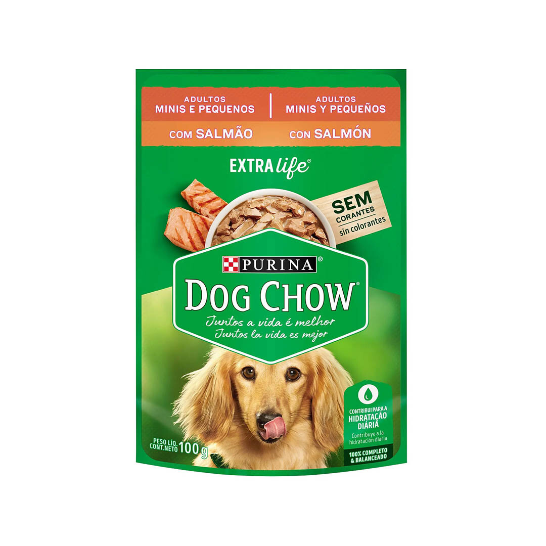 Dog Chow Pouch Small Salmón 100 Gr Alimento balanceado completo húmedo para perros adultos de tamaños mini o pequeños. Con Extralife: una mezcla especial con antioxidantes, vitaminas y minerales para maximizar su calidad de vida. Contribuye a la hidratación diaria. Sin colorantes.