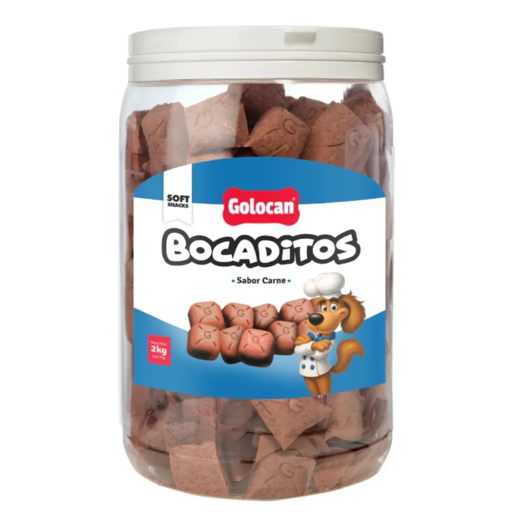 Golocan Bocaditos Carne x 2kg. Snacks blandos y semihúmedos que deleitarán a tu mascota con su variedad de sabores. Cada bocadito está formulado para ofrecer una textura irresistible y fácil de masticar, ideal para perros de todas las edades. Perfectos como premio o recompensa diaria, estos snacks se hornean con ingredientes de calidad que cuidan la salud de tu mascota. Beneficios Clave: Textura blanda y sabrosa, fácil de masticar. Ideales como recompensa en el entrenamiento. Tip: Perfectos para fortalecer el vínculo con tu mascota y reemplazar golosinas dulces u otros productos no recomendados para perros. Sin colorantes artificiales. Certificados por SENASA, garantía de calidad y seguridad. Aprobados para perros de todas las razas y edades, con cantidades diarias recomendadas según su tamaño. Conservación: Mantené el producto en su envase cerrado en un lugar fresco y seco. No olvides dejar siempre un recipiente con agua limpia y fresca a disposición de tu mascota.